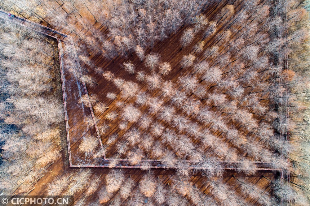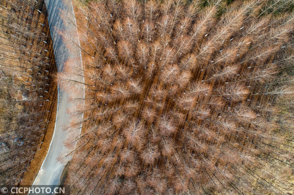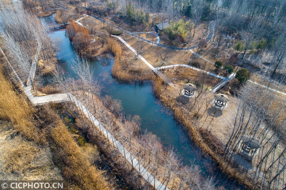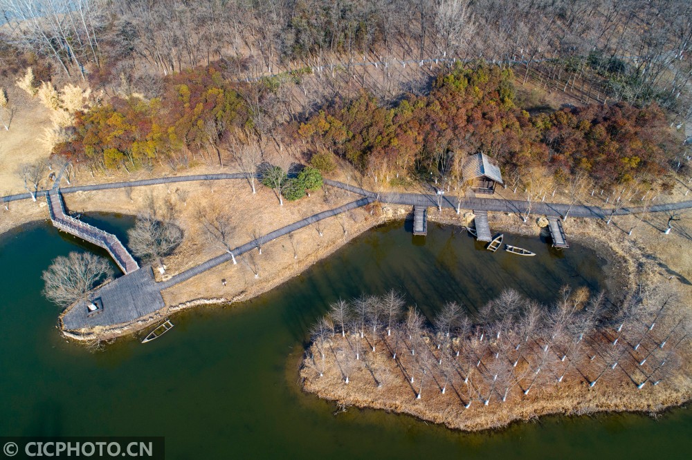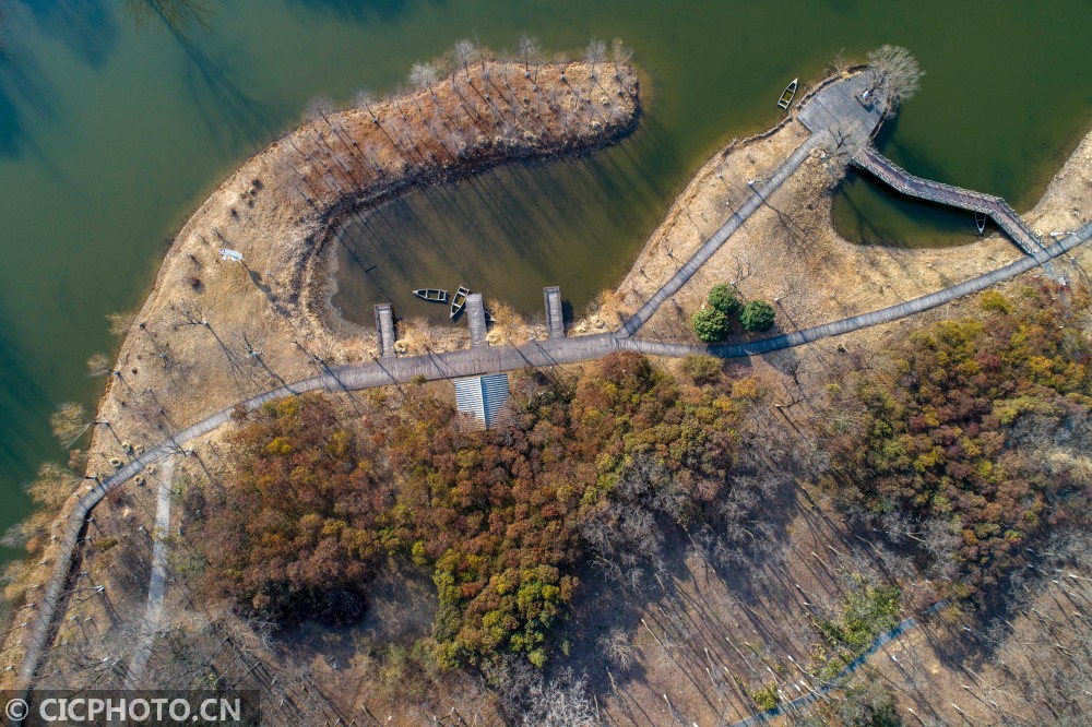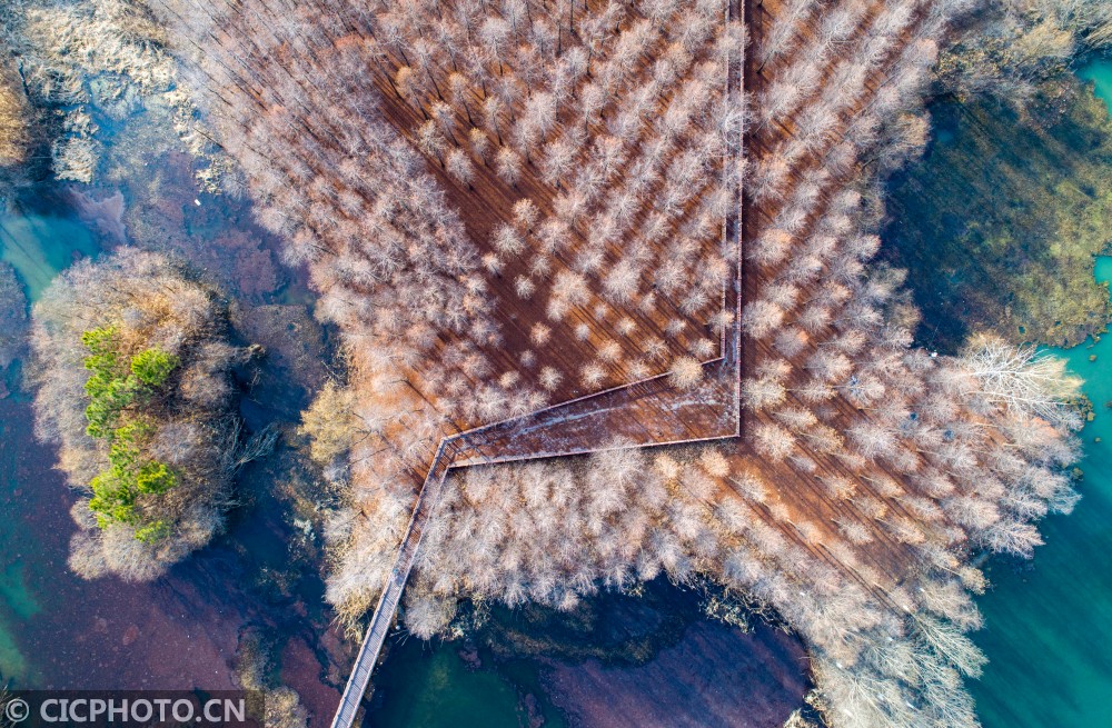 以上图片:2021年2月2日在江苏省淮安市古淮河国家湿地公园拍摄的苍翠树木和碧绿水面。CICPHOTO/贺敬华 摄
