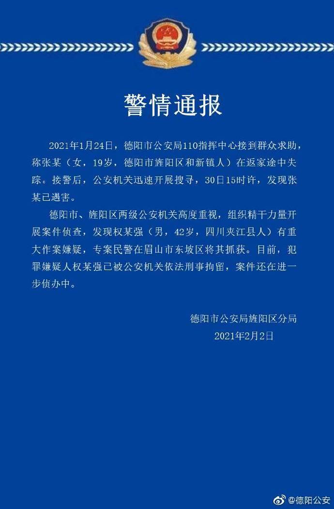 四川德阳“19岁失联女孩被害案”告破,嫌犯已被刑拘