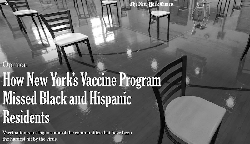 《纽约时报》援引纽约市前卫生官员玛丽·巴塞特的观点称,“现在有能力接种疫苗的人是享有特权的人,这些人并不是面临最高患病和死亡风险的人。这个问题必须解决。”