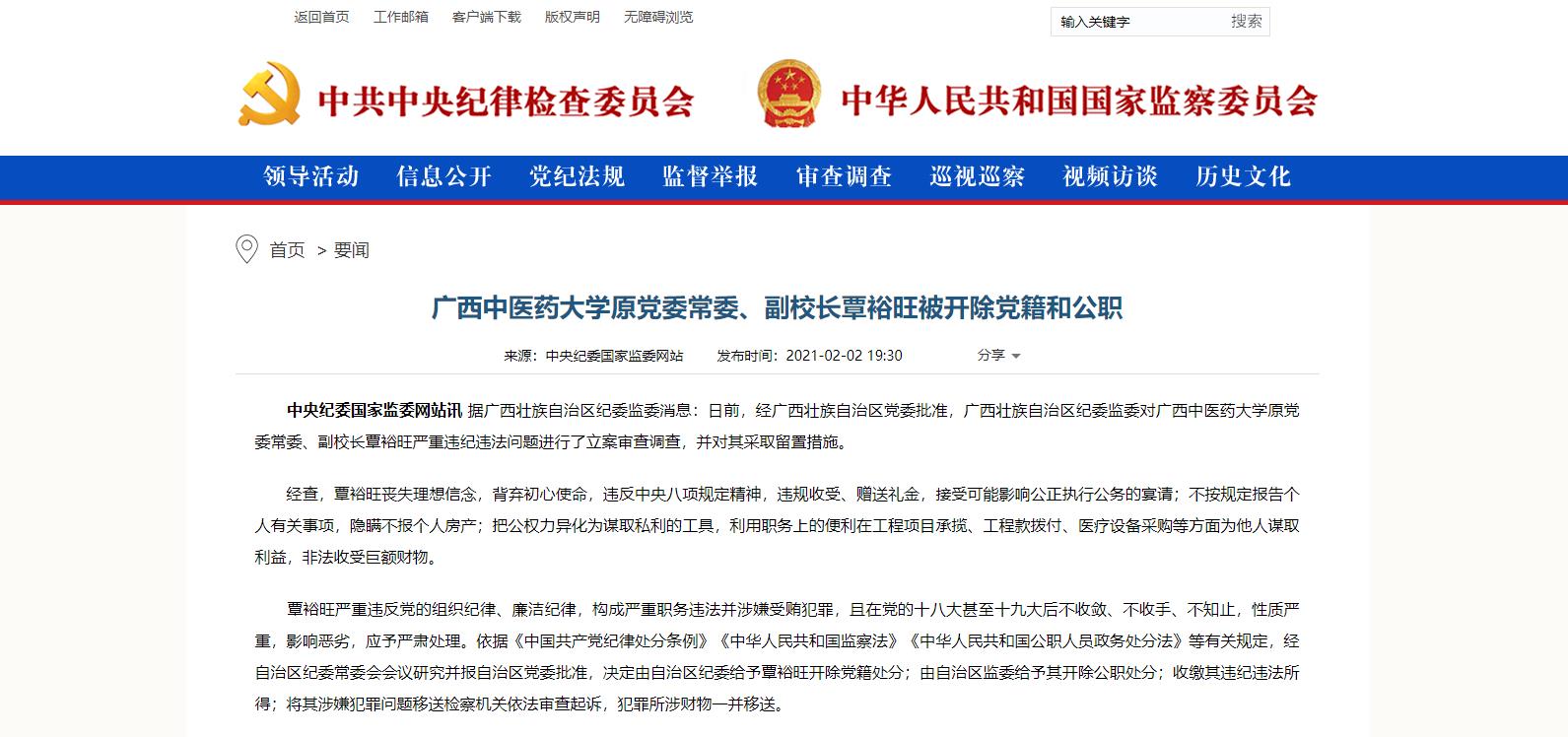 据广西壮族自治区纪委监委消息:日前,经广西壮族自治区党委批准,广西壮族自治区纪委监委对广西中医药大学原党委常委、副校长覃裕旺严重违纪违法问题进行了立案审查调查,并对其采取留置措施。