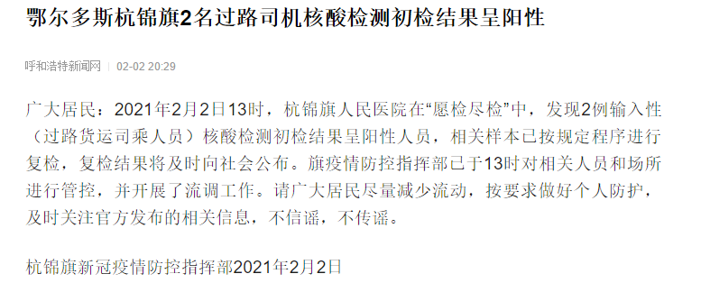 据杭锦旗新冠疫情防控指挥部消息,2021年2月2日13时,杭锦旗人民医院在“愿检尽检”中,发现2例输入性(过路货运司乘人员)核酸检测初检结果呈阳性人员,相关样本已按规定程序进行复检,复检结果将及时向社会公布。旗疫情防控指挥部已于13时对相关人员和场所进行管控,并开展流调工作。