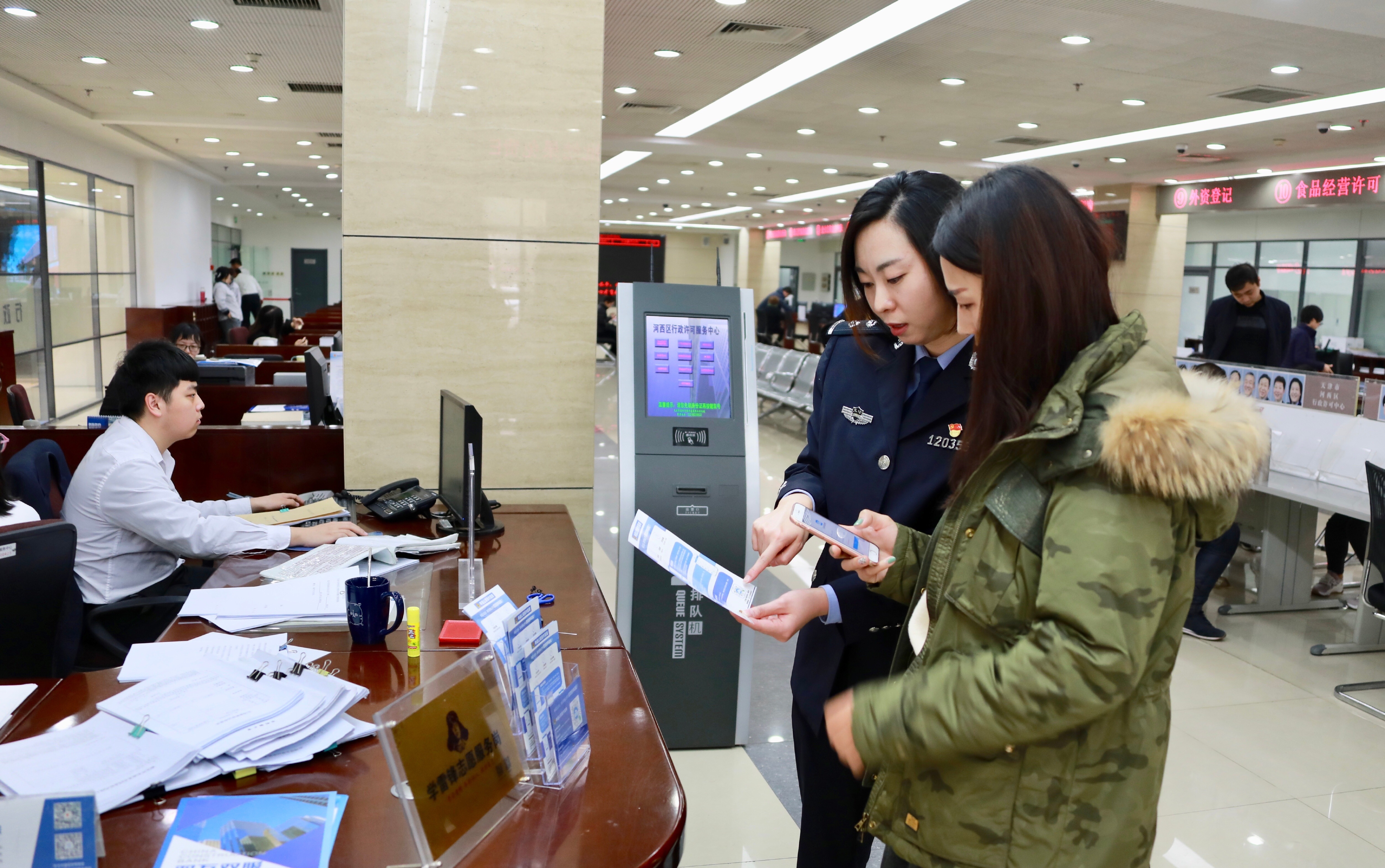 天津一行政许可服务大厅内,民警为群众讲解在线公章申请流程。(天津市公安局供图)