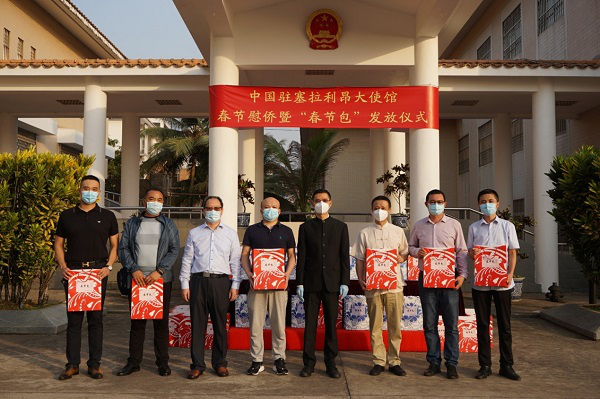 △当地时间1月29日,中国驻塞拉利昂使馆向部分在塞同胞发放“春节包”。(总台记者 王新俊)