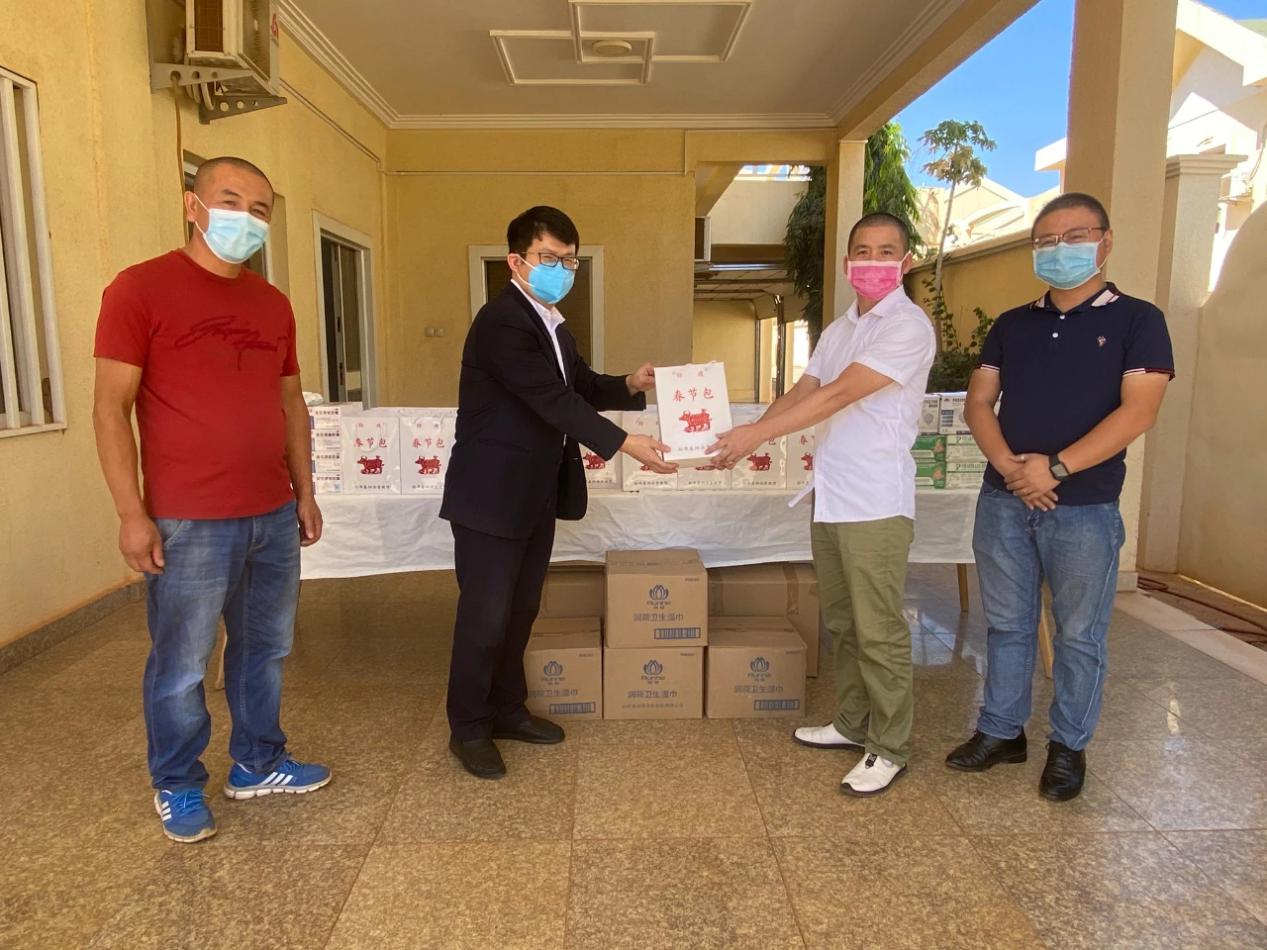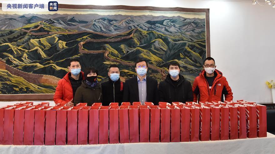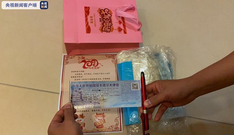 △当地时间2月1日,中国驻卡塔尔使馆向旅卡侨胞和中资企业一线职工代表发放600余个“春节包”,包括了口罩、一次性手套、手消毒液等防疫物资,以及一支写有疫情期间卡塔尔使馆紧急联系方式和详细办事流程和对外办公时间的拉画笔,此外还附有一封驻卡塔尔使馆至当地华人华侨和中资机构的春节贺信。(总台记者 张雨辰)