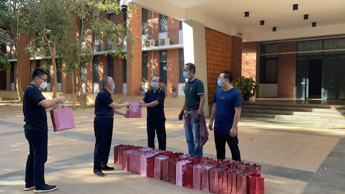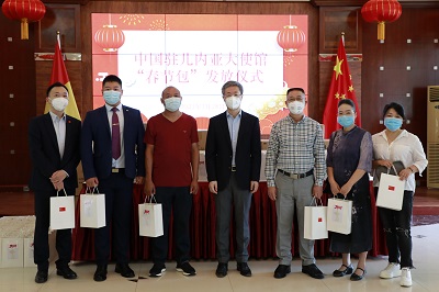 △当地时间1月28日,中国驻几内亚使馆向在几中国同胞发放“春节包”。(总台记者 王新俊)