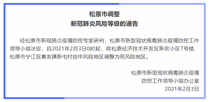 经松原市新冠肺炎疫情防控专家研判,松原市新型冠状病毒肺炎疫情防控工作领导小组决定,自2021年2月3日0时起,将松原经济技术开发区新农小区7号楼、松原市宁江区善友镇新屯村由中风险地区调整为低风险地区。