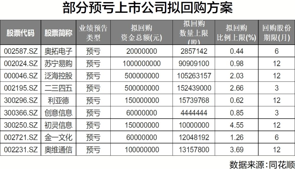 《经济参考报》记者统计发现,今年以来约有10余家公司在披露业绩预亏前后发布了回购公司股份方案。仅近5个交易日,就有初灵信息、苏宁易购、利亚德、二三四五、泛海控股、苏宁易购等多家公司披露股份回购信息。