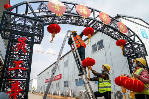 (图片说明)新华社照片,无锡,2021年2月2日,外来务工人员在项目生活区挂灯笼。