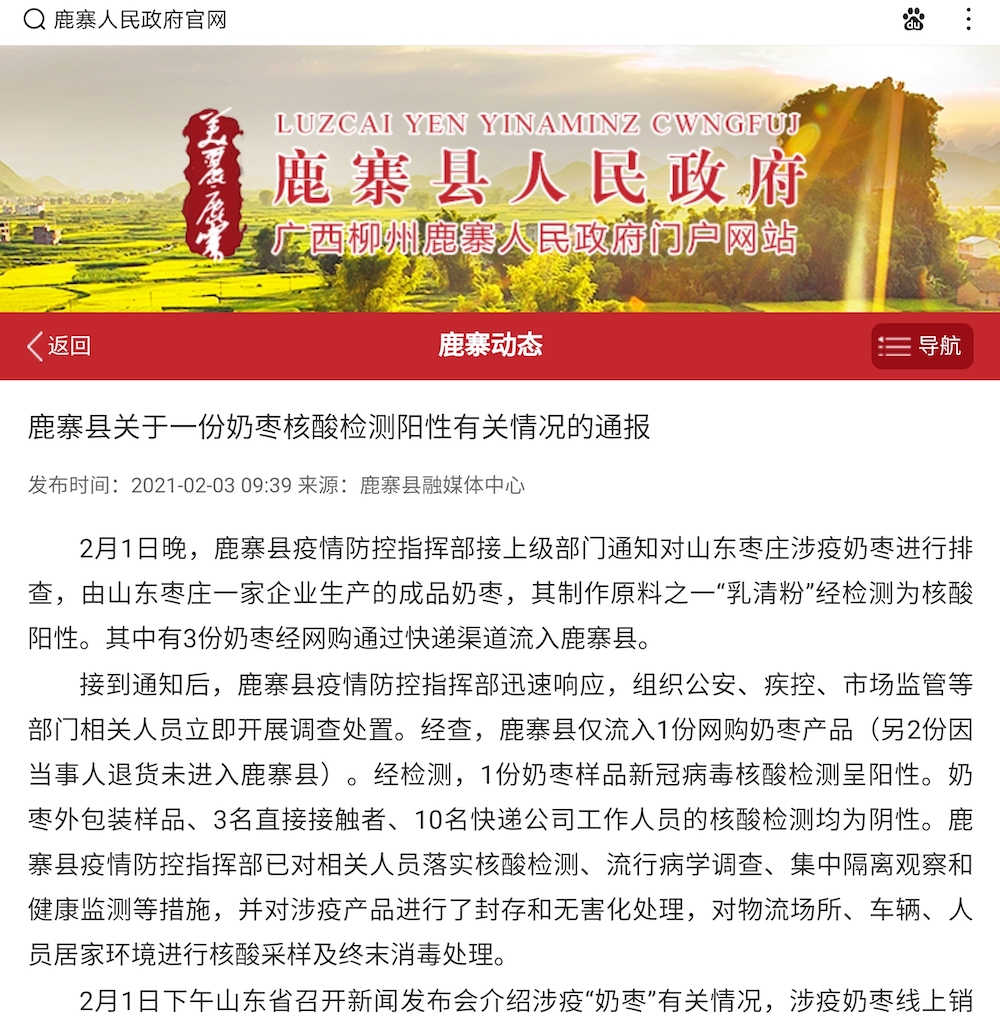 2月2日,广西柳州鹿寨县新型冠状病毒感染的肺炎疫情联防联控工作领导小组指挥部发布通报称:2月1日晚,鹿寨县疫情防控指挥部接上级部门通知对山东枣庄涉疫奶枣进行排查,由山东枣庄一家企业生产的成品奶枣,其制作原料之一“乳清粉”经检测为核酸阳性。其中有3份奶枣经网购通过快递渠道流入鹿寨县。