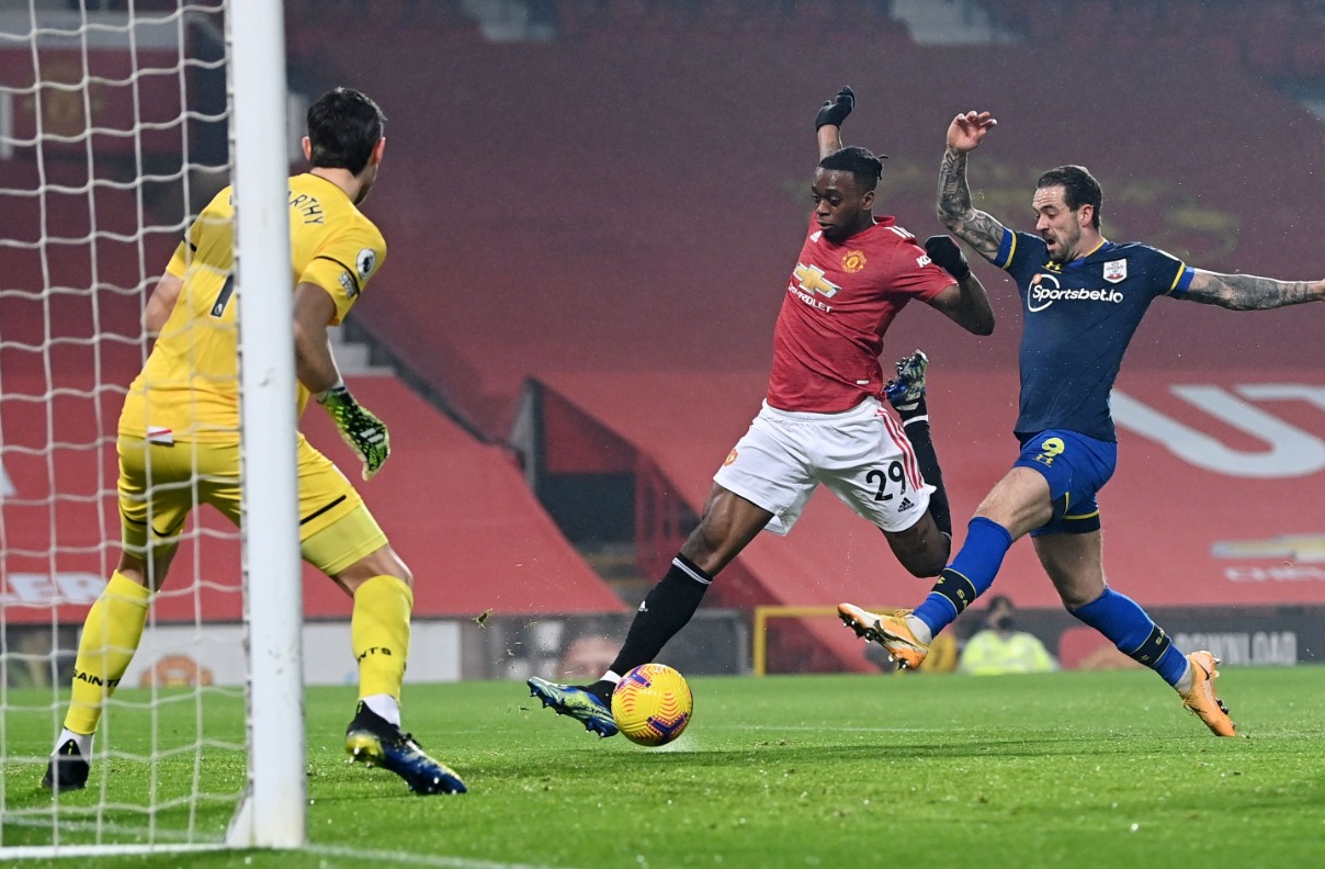图为2月2日,曼联队球员万-比萨卡(中)在比赛中攻入球队首粒进球。新华社/路透