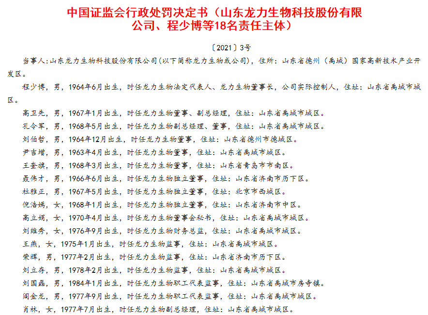 证监会决定对龙力生物责令改正,给予警告并处以60万元罚款;并对时任龙力生物法定代表人、龙力生物董事长,公司实际控制人程少博等多名责任主体给予警告,并处以罚款。时任董事长被采取终身证券市场禁入措施。