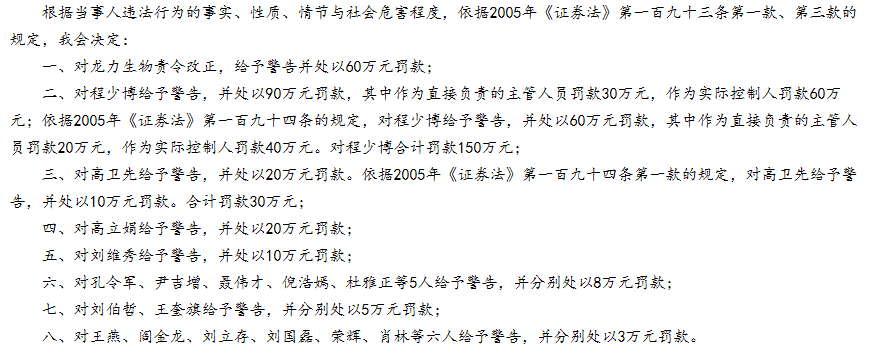 最终证监会决定对龙力生物责令改正,给予警告并处以60万元罚款;对程少博给予警告,并处以合计罚款150万元。对18名责任主体开出的罚款金额累计338万元。