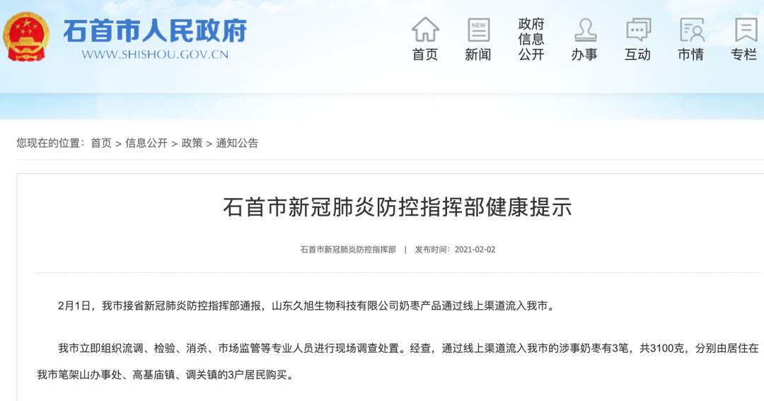 2月1日,石首市接省新冠肺炎防控指挥部通报,山东久旭生物科技有限公司奶枣产品通过线上渠道流入石首。