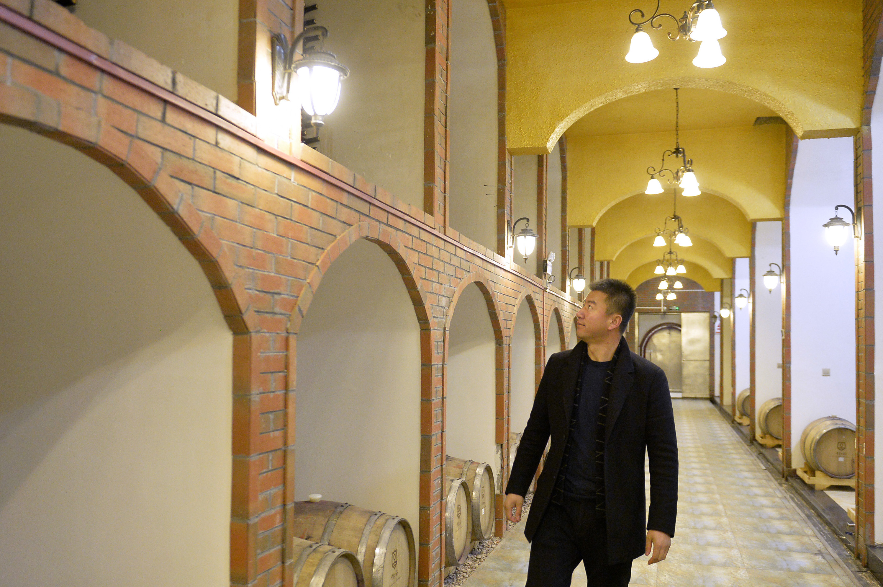 2021年1月6日,酿酒师李财在酒窖里检查储存的葡萄酒。(新华社记者唐如峰 摄)