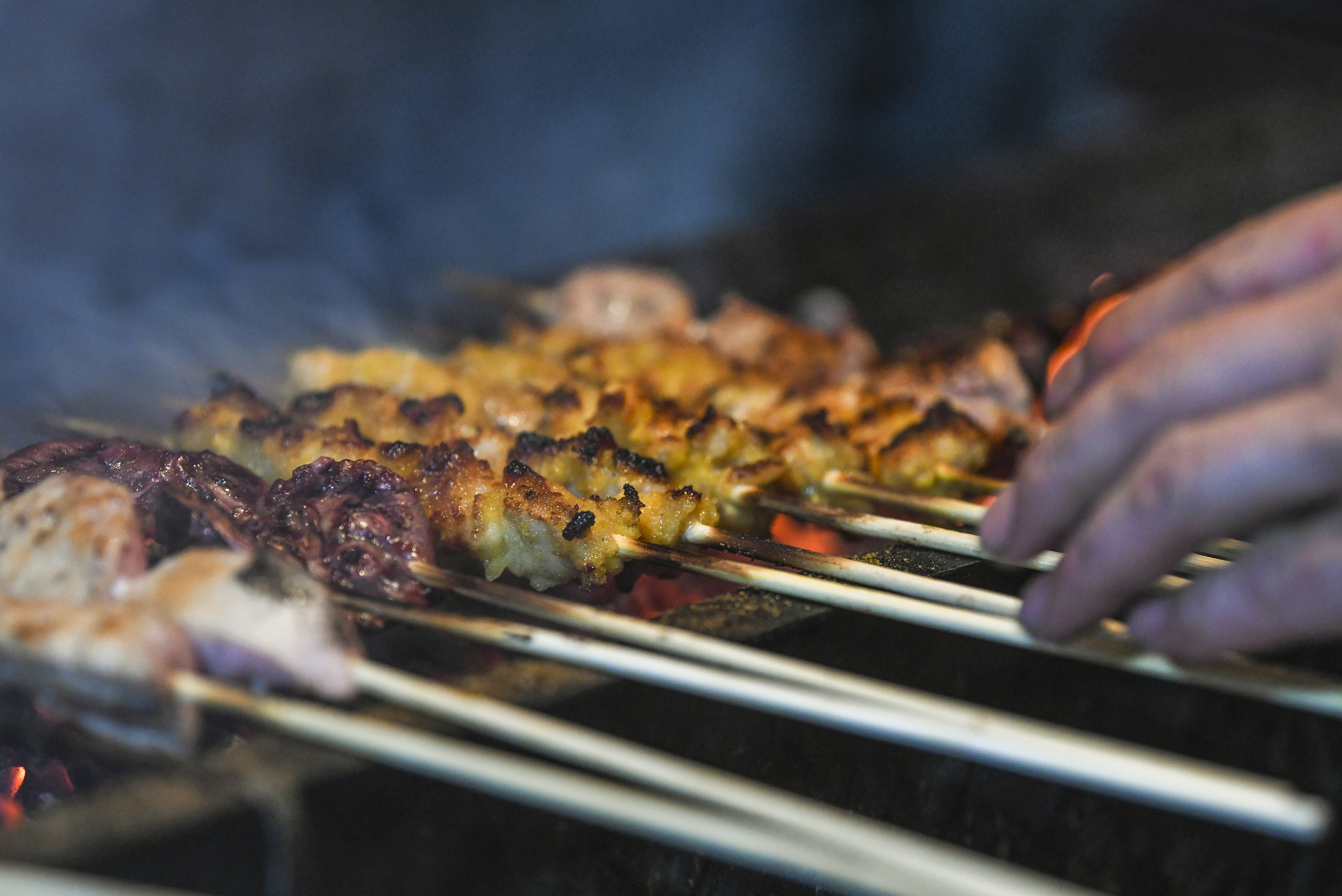 在新疆喀什市欧尔达路的夜市上,一名烧烤摊贩在烤制肉串(2019年8月12日摄)。新华社记者 王菲 摄