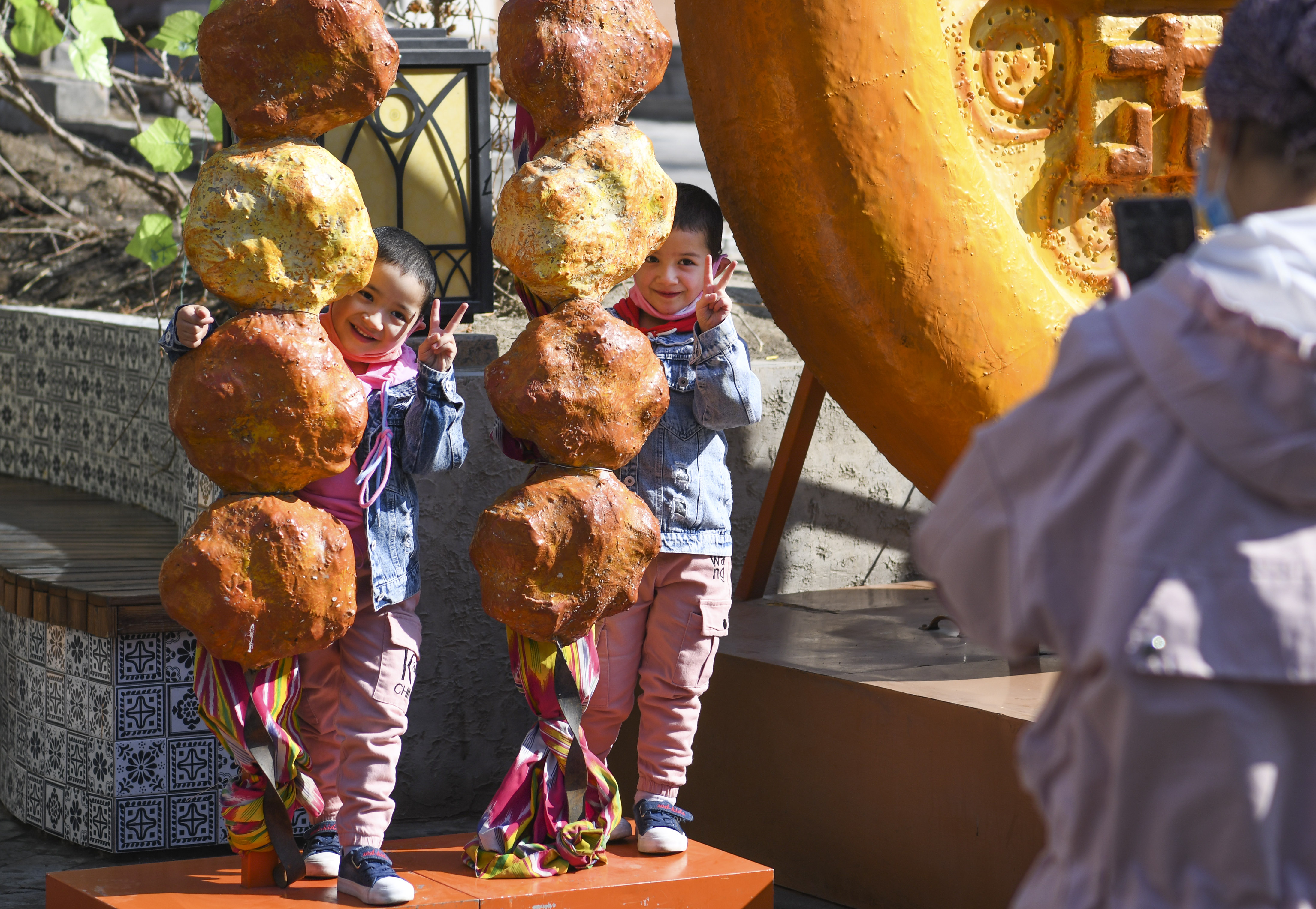 在位于乌鲁木齐的大巴扎景区内,人们在羊肉串雕塑旁留影(2020年3月21日摄)。新华社记者 王菲 摄