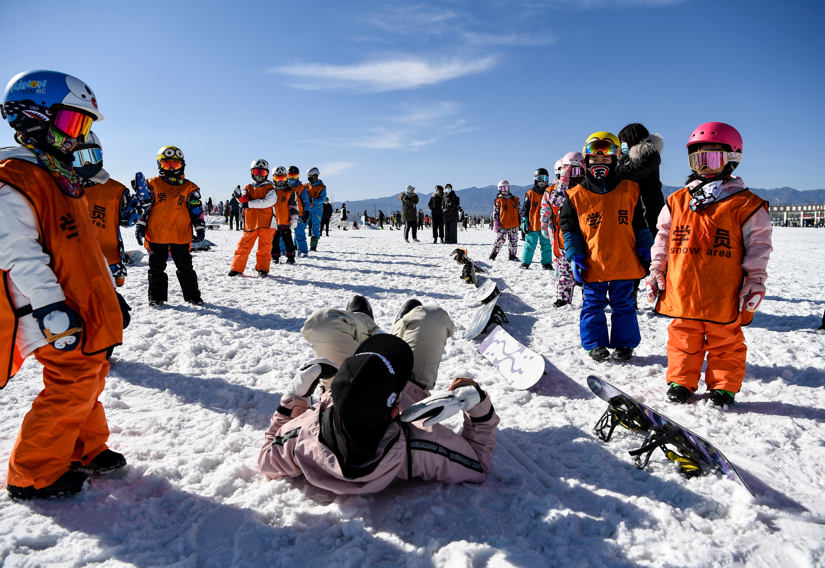 在阅海滑雪场一处雪地,教练李智昊在教十几名年龄在6到14岁之间的孩子单板滑雪。他双膝跪地,随后趴在雪地上,演示正确的摔倒姿势。