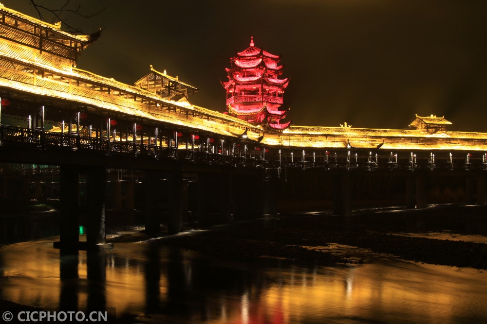 春节临近,湖南省湘西土家族苗族自治州龙山县苗儿滩镇捞车河村用五彩缤纷的灯光装扮一新,迎接新春的到来。