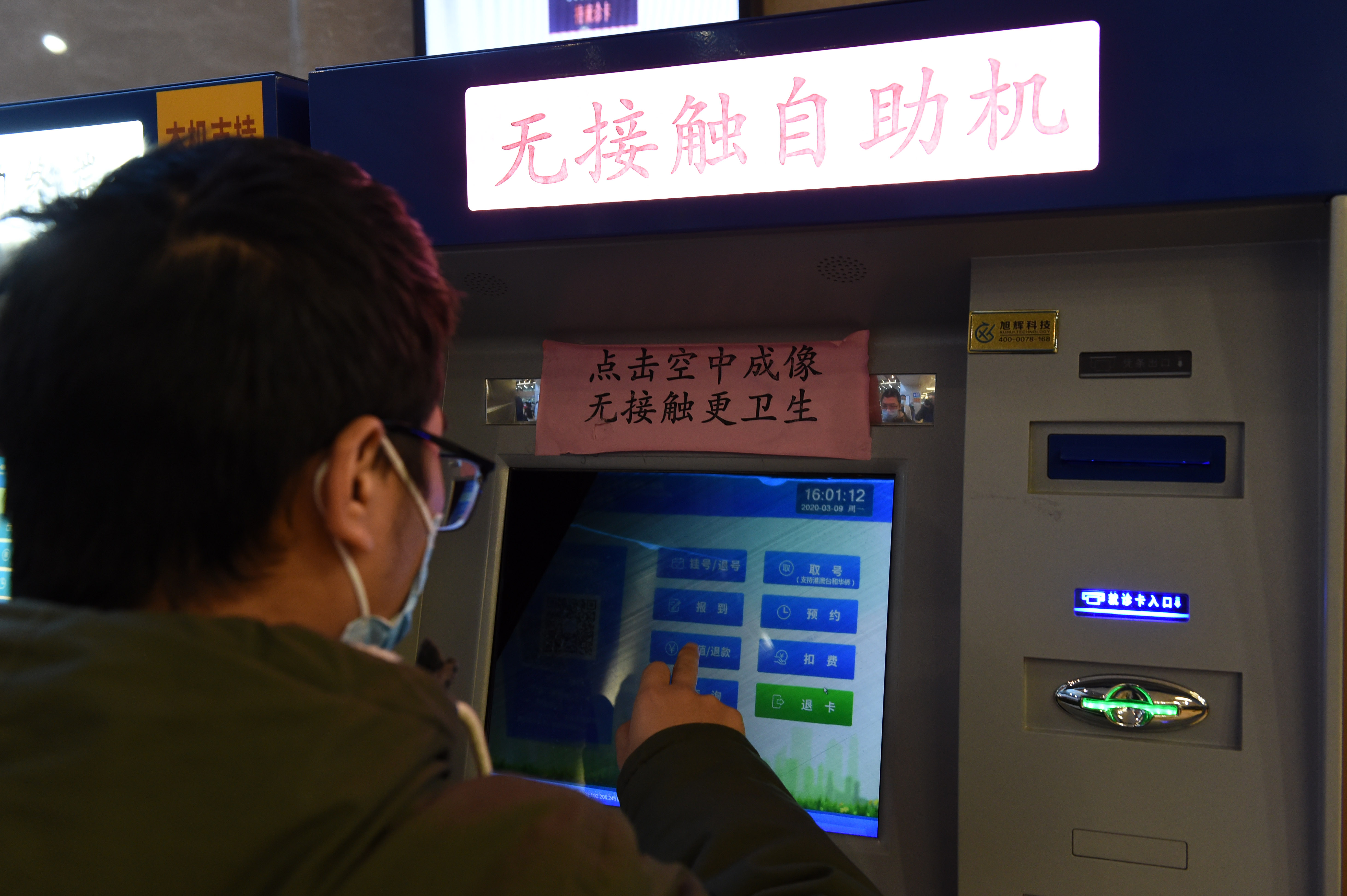 东超科技研发的“无接触自助机”,利用“可交互全息空气成像”技术,就诊者在空气中就能完成操作。(新华社记者周牧摄)