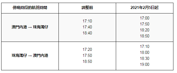澳门特区政府海事及水务局3日公布,为满足珠澳两地居民在傍晚下班客流繁忙时段的同行需求,经珠澳两地有关部门协商,从2月5日开始,珠海湾仔往来澳门内港的海上航线将在傍晚增加往返方向各一班航班,以疏导繁忙时段的客流。