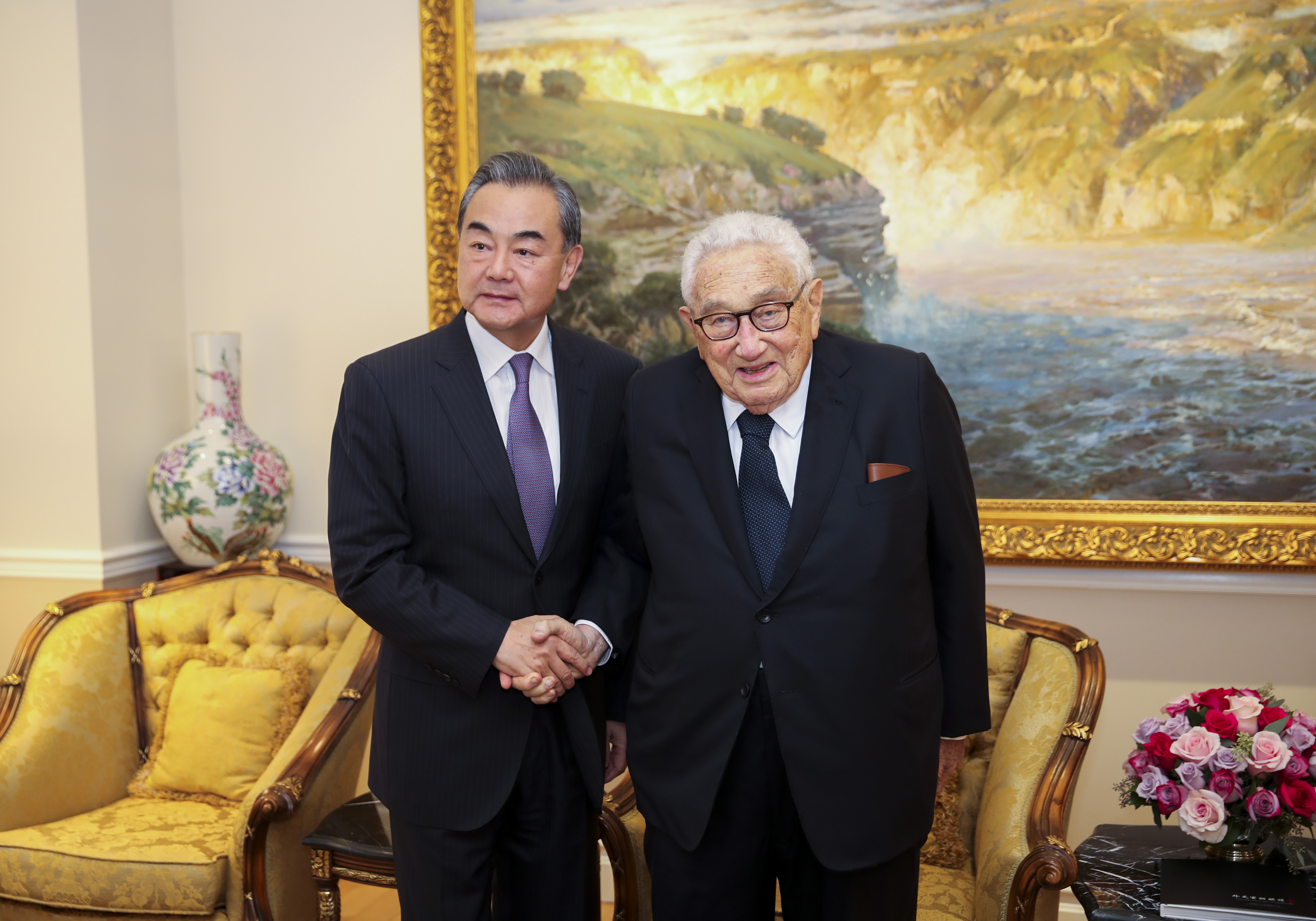 2018年9月25日,中国国务委员兼外长王毅(左)在纽约会见美国前国务卿基辛格。新华社记者王迎摄