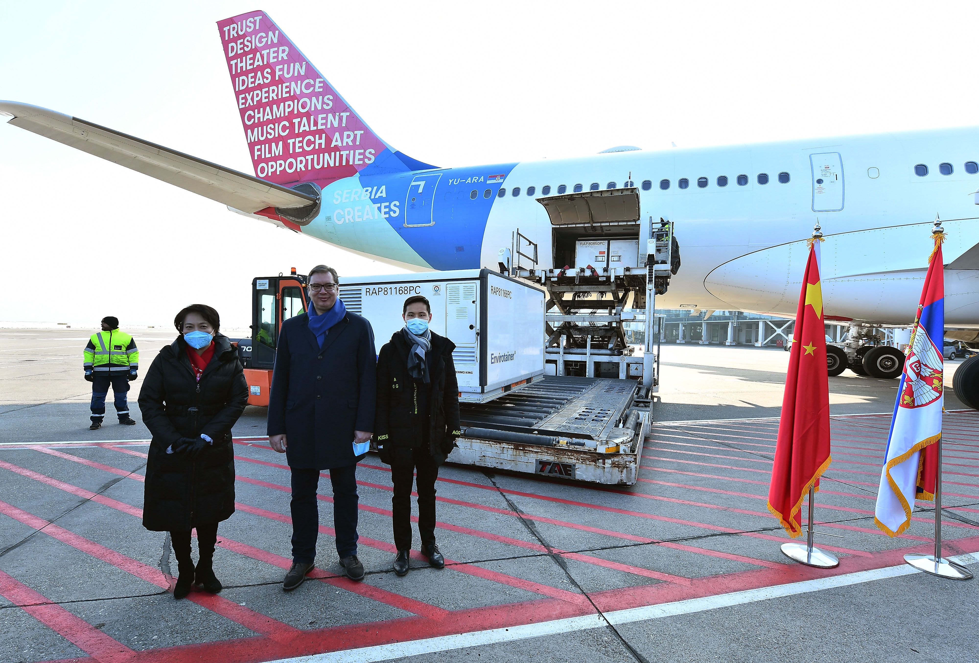 1月16日,在塞尔维亚首都贝尔格莱德,塞尔维亚总统武契奇(前排中)等在机场迎接首批中国新冠疫苗。新华社发(普雷德拉格·米洛萨夫列维奇 摄)