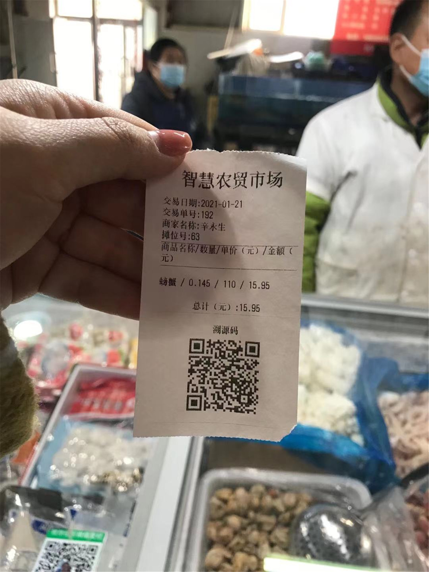 市民张慧准备买白虾,她走到一家海鲜产品摊位前,通过摊位上方的显示屏挑选食材,在显示屏上单价、总价、重量一目了然,她打开手机,扫码、支付、打印凭条,整个流程仅用了6分钟。