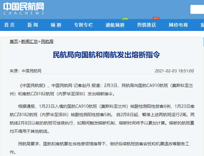 据中国民航网3日消息,2月3日,民航局向国航CA910航班(莫斯科至兰州)和南航CZ8182航班(内罗毕至深圳)发出熔断指令。