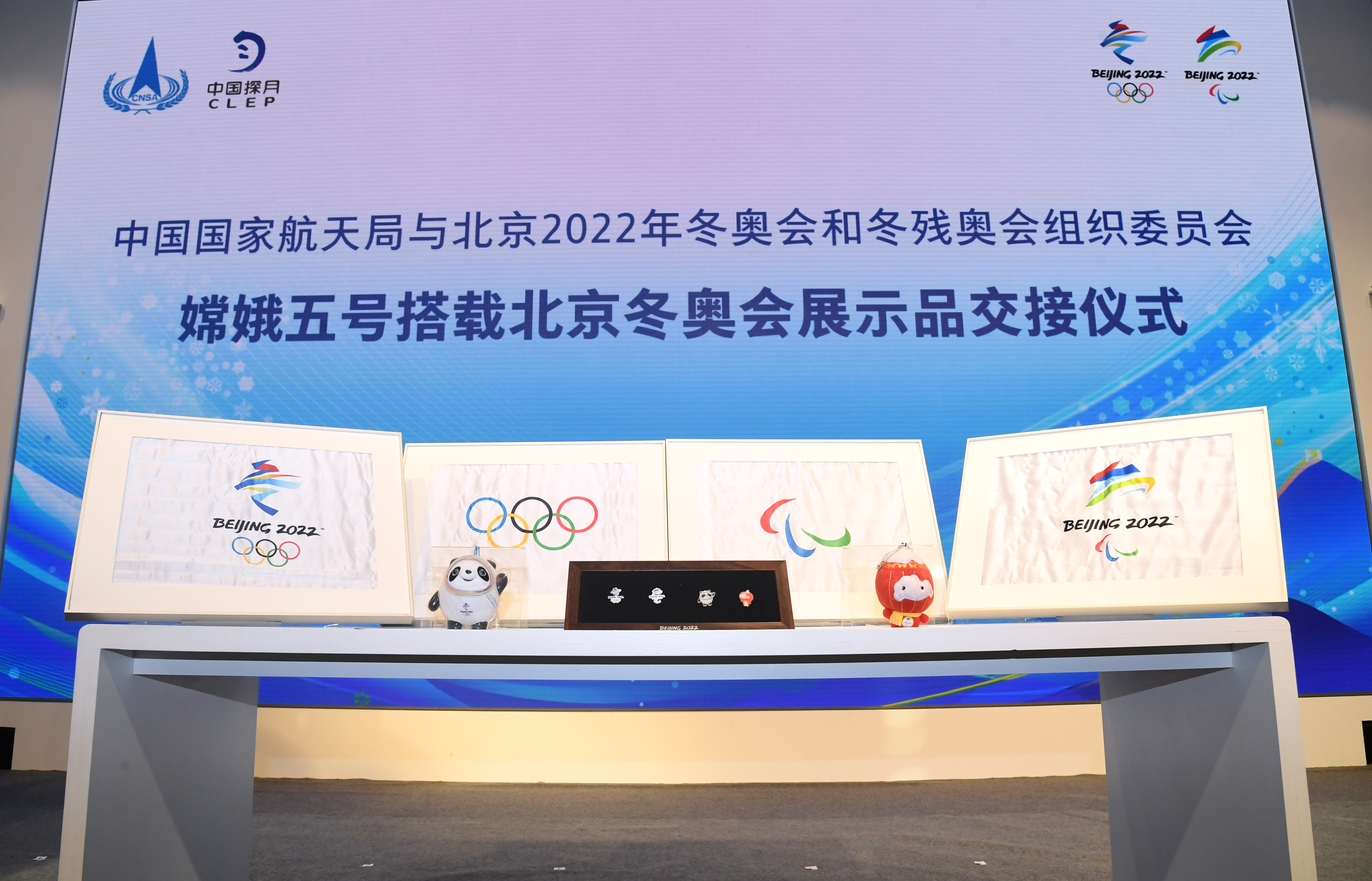 2020年12月21日,嫦娥五号搭载北京冬奥会展示品交接仪式在北京冬奥组委首钢办公区举行,冬奥会会旗、会徽、吉祥物等展示品在完成月球之旅后返回。