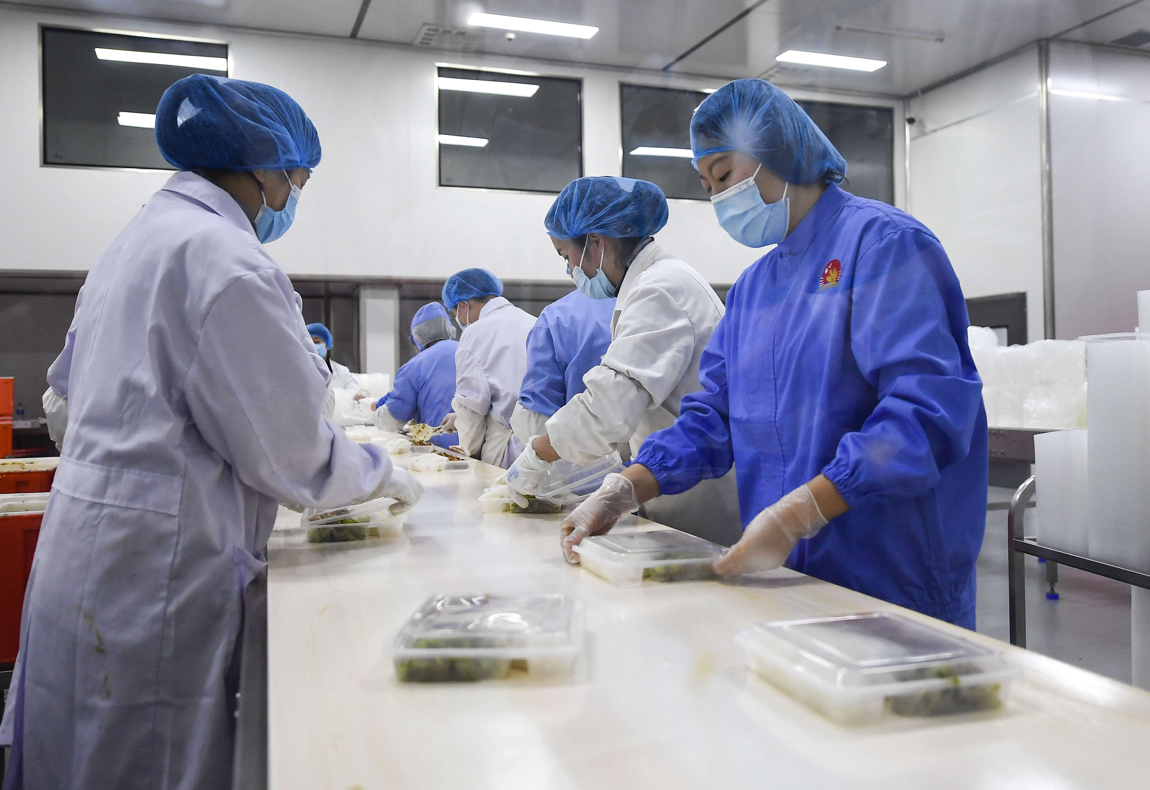 吉林通化,工作人员在车间内将饭菜装盒打包。(新华社发)