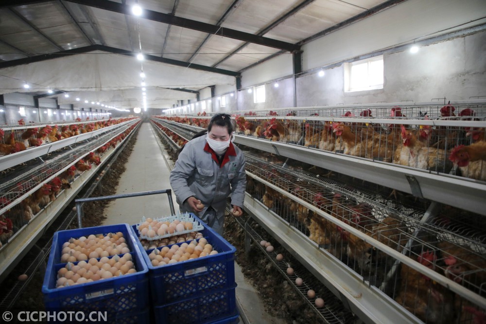 ↑2021年2月3日,在江苏省泰州市姜堰区大伦镇朱宣村一家炕孵企业,工人在种鸡场捡拾鸡蛋。CICOHOTO/顾俊 摄