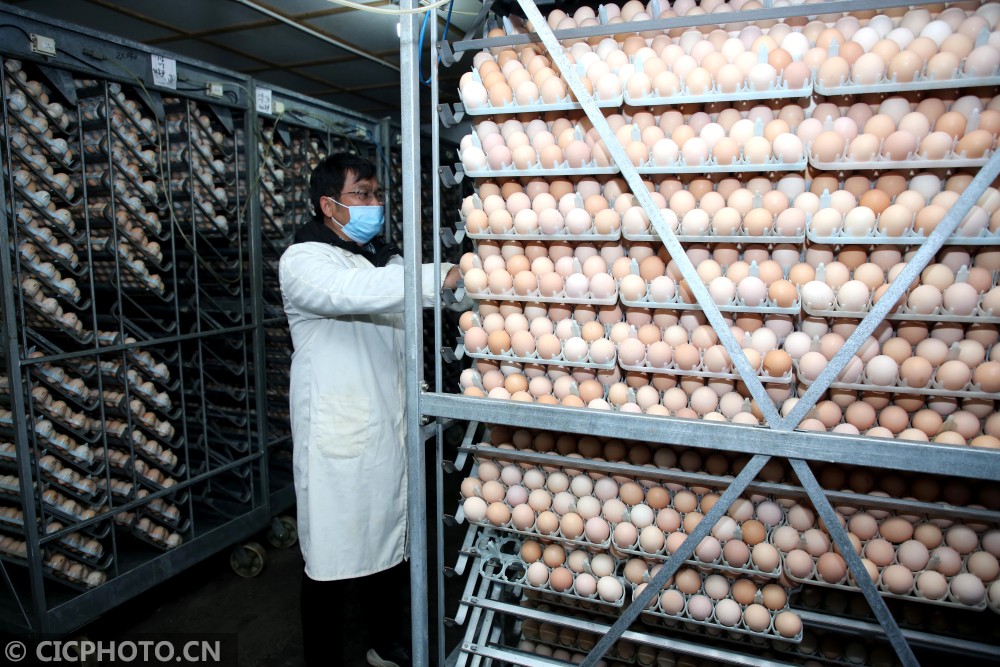 ↑2021年2月3日,在江苏省泰州市姜堰区大伦镇朱宣村一家炕孵企业,工人在种蛋房检查种蛋。CICOHOTO/顾俊 摄