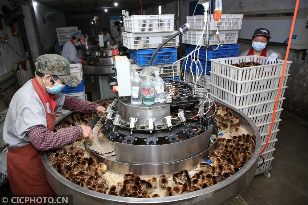 ↑2021年2月3日,在江苏省泰州市姜堰区大伦镇朱宣村一家炕孵企业,工人在生产线上为鸡苗自动注射疫苗。CICOHOTO/顾俊 摄