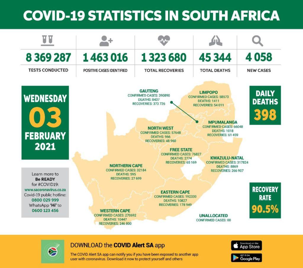 当地时间2月3日,南非卫生部确认,南非当天新增新冠肺炎确诊病例4058例,累计确诊1463016例;新增死亡病例398例,累计死亡45344例;累计康复1323680例。