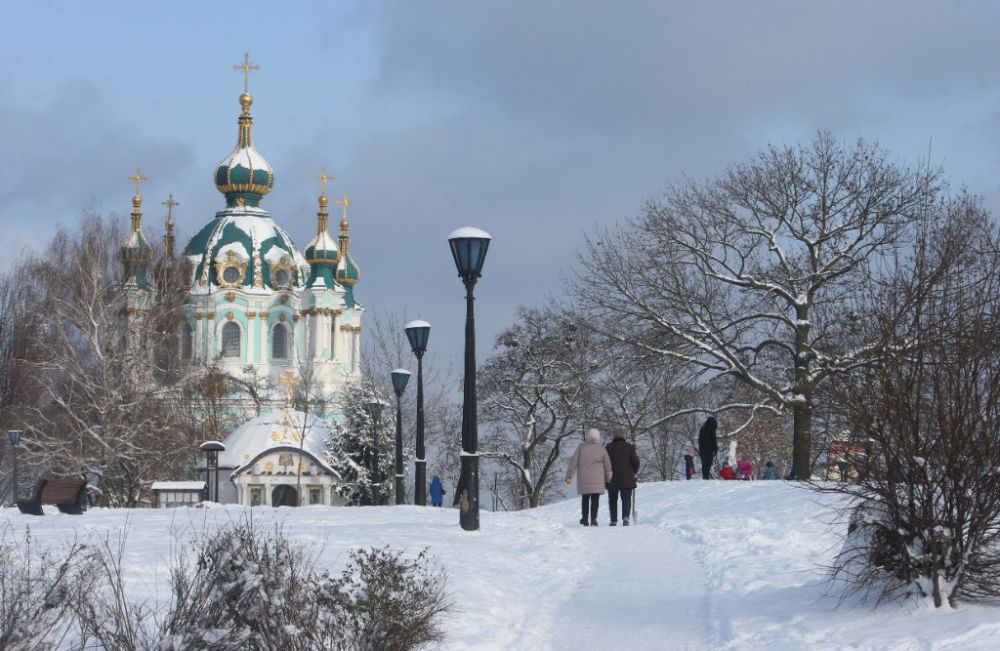 1月15日在乌克兰首都基辅拍摄的白雪映衬下的圣安德烈教堂。(新华社发,谢尔盖·斯塔拉斯坚科摄)