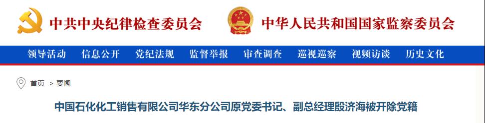 中央纪委国家监委网站今日(2月4日)发布通告,据中国石油化工集团有限公司纪检监察组、上海市监委消息:日前,中国石油化工集团有限公司纪检监察组、上海市监委对中国石化化工销售有限公司华东分公司原党委书记、副总经理殷济海严重违纪违法问题进行了立案审查调查。