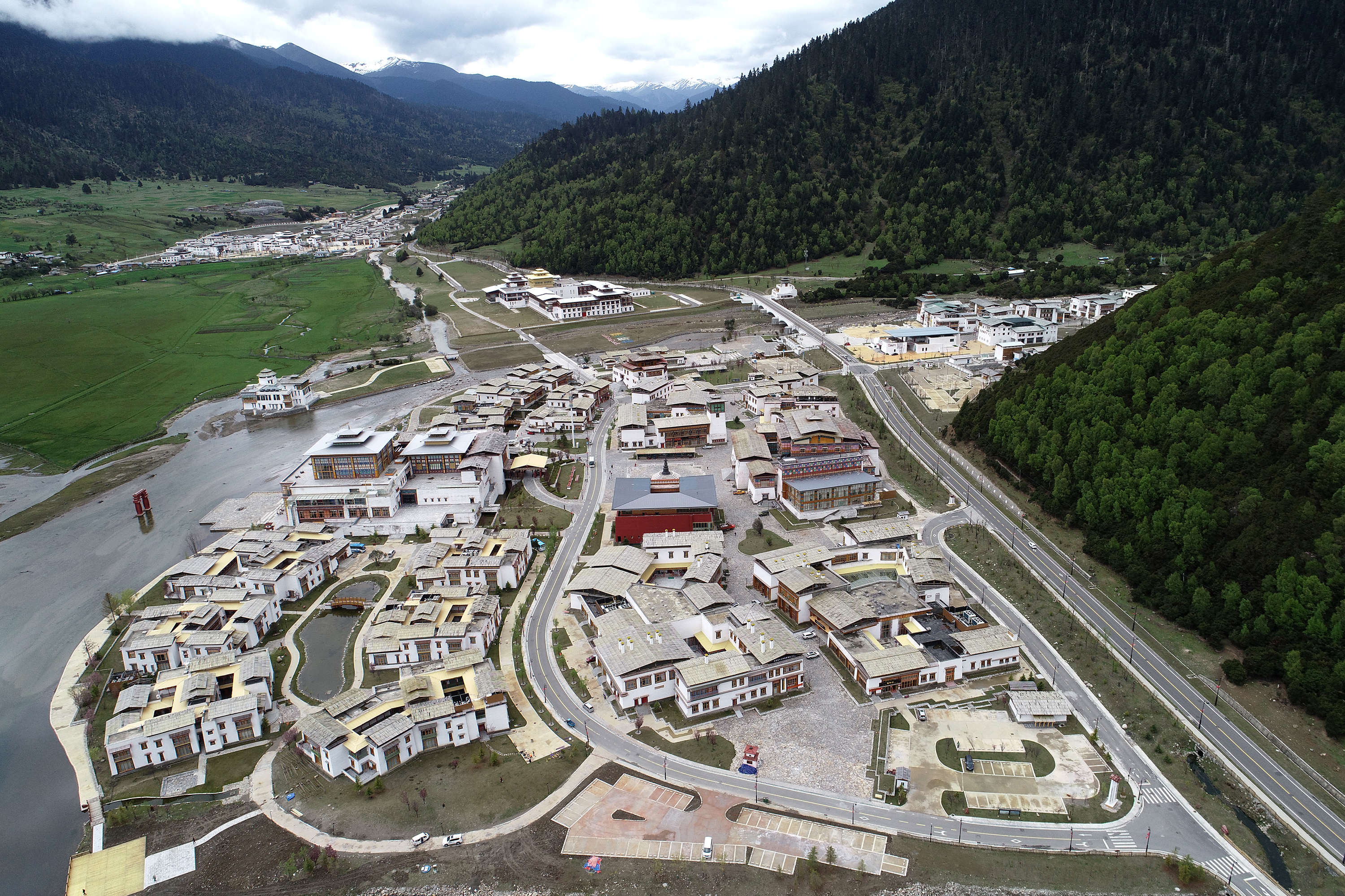 川藏公路旁的鲁朗国际旅游小镇(2019年5月28日摄,无人机照片)。 新华社记者 李鑫 摄