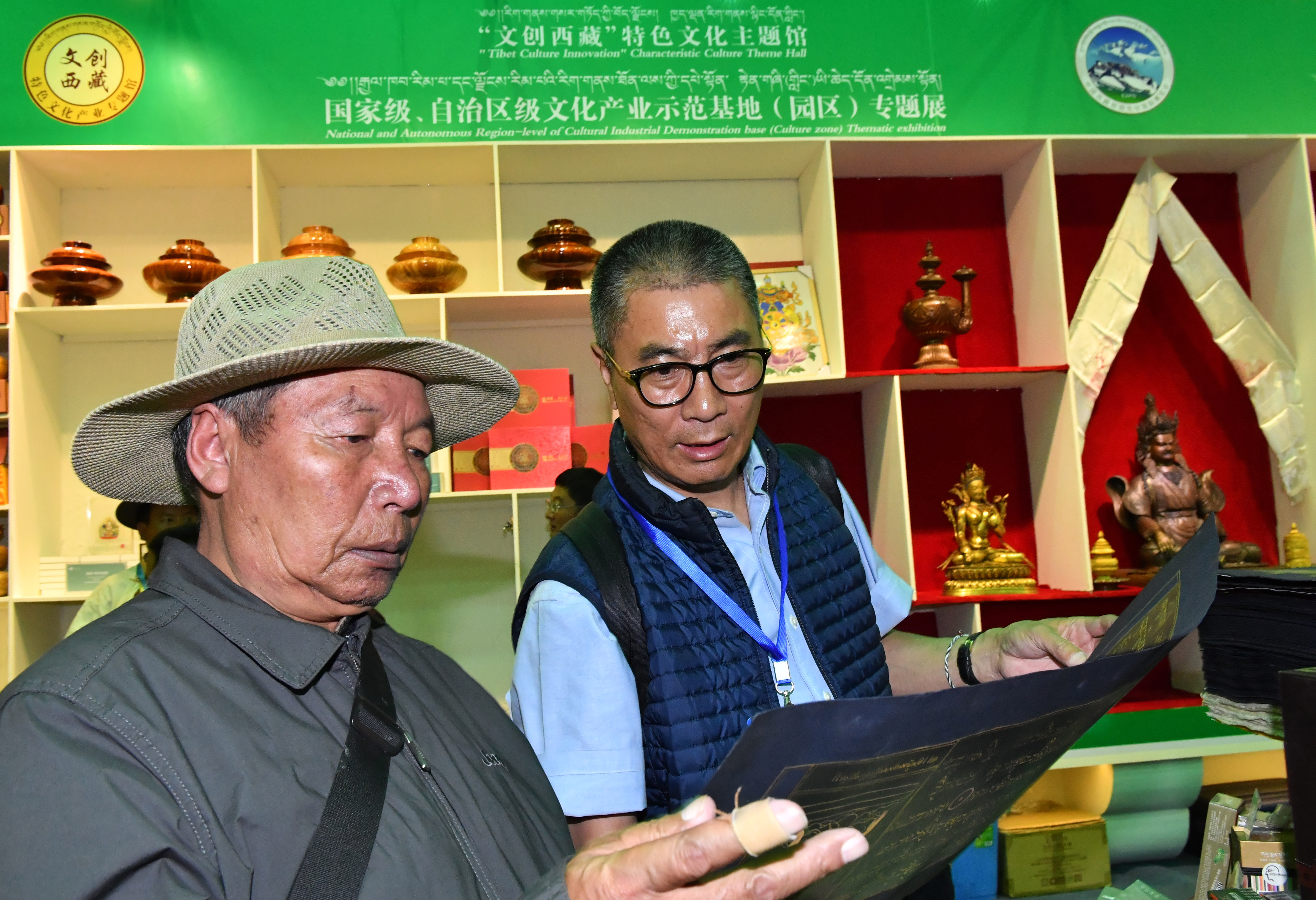 2018年9月,第四届中国西藏旅游文化国际博览会在拉萨举行。这是文化传承人江措(右)在博览会上展示藏纸(2018年9月8日摄)。新华社记者 觉果 摄