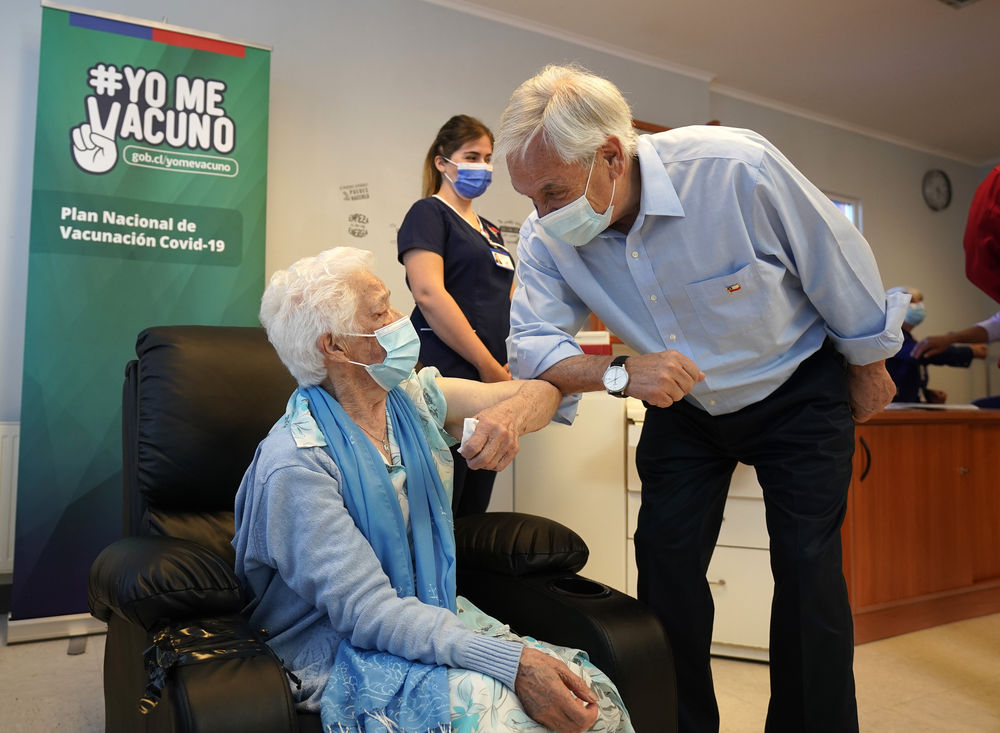 2月3日,智利总统皮涅拉(右)在智利河大区福德罗诺市问候93岁的老人埃内斯蒂娜·戈多伊。戈多伊是智利当日第一位接种中国科兴疫苗的老人。(新华社发,智利总统府供图)
