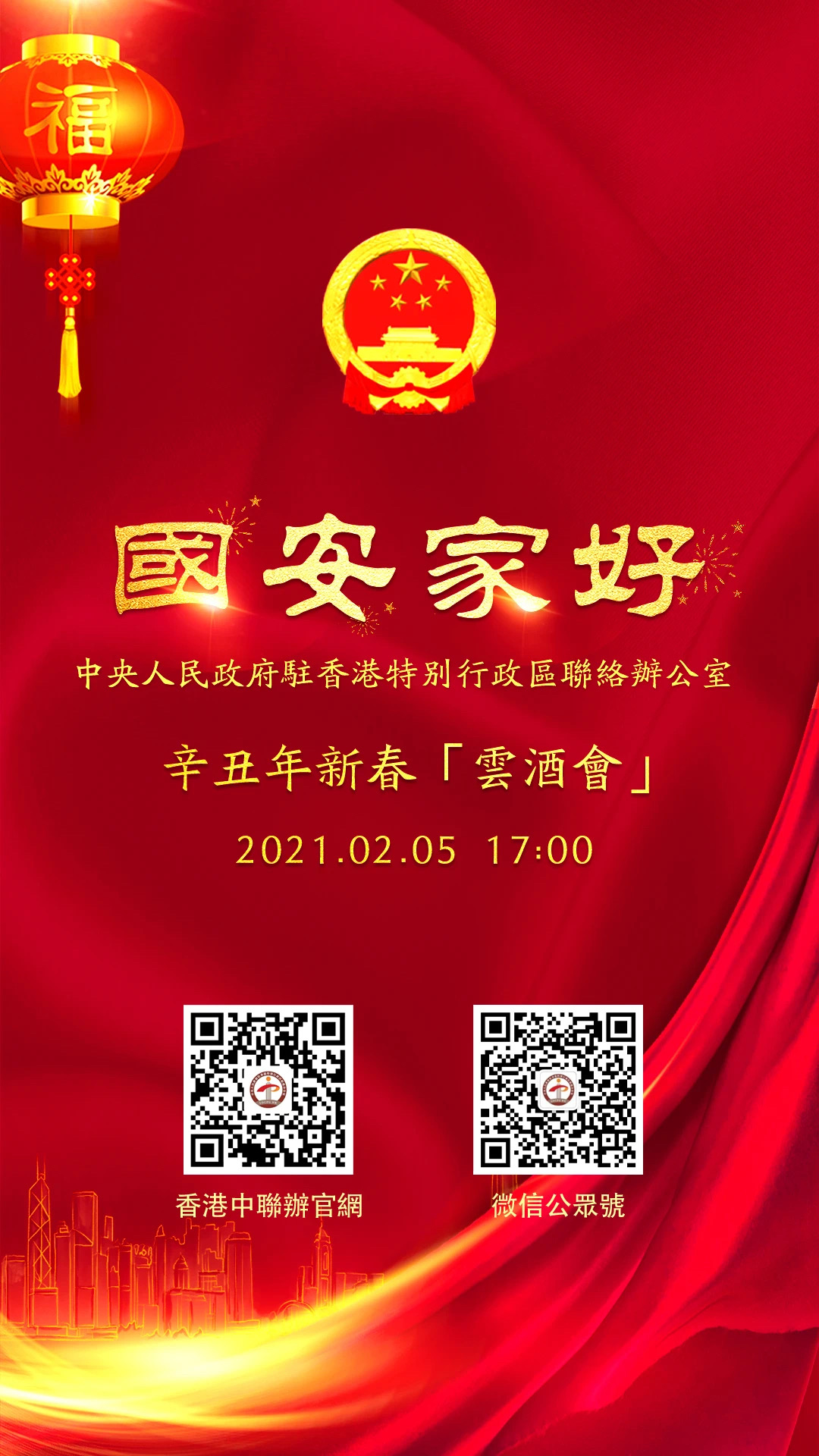 中央人民政府驻香港特别行政区联络办公室将于2月5日17时在线举办2021年新春酒会,与广大香港市民共叙友谊,欢庆佳节。