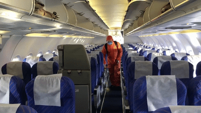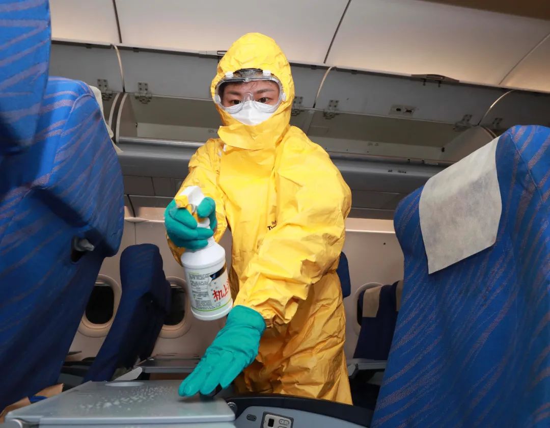 消杀人员每次上机作业需从前到后、从后到前,缓步匀速喷洒两遍消毒液,包括客舱座椅、卫生间、行李架、壁板、客舱过道、垃圾桶、餐车停放处均要进行消毒。