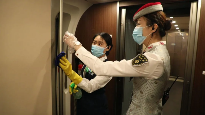列车针对旅客经常触碰的门把手、扶手、按钮等定时定点进行消毒,从源头阻断疫情传播。