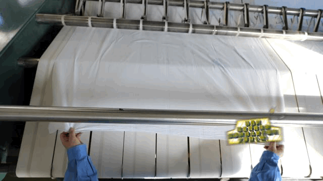 经过洗涤的卧具被烘干后,工作人员会用高温熨烫机进行最后的处理:一方面熨烫卧具至平整,另一方面可以进一步高温消毒。熨烫温度可达175℃左右,保证有效杀灭细菌和病毒。