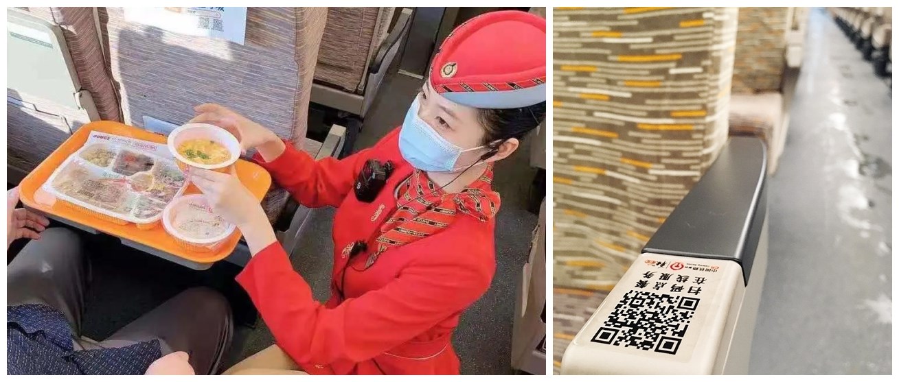 为了避免聚集用餐,列车工作人员会将餐食送至旅客座位。乘坐高铁的旅客还可以扫描座椅上的二维码,享受“无接触”点餐服务。