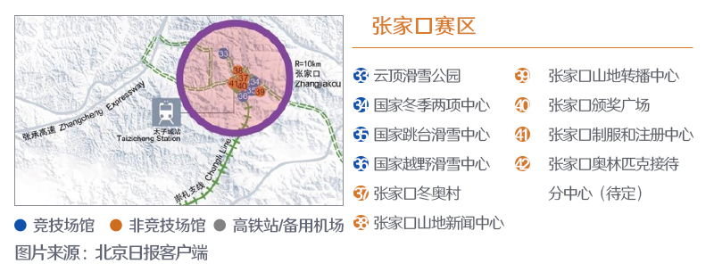 张家口赛区位于河北省张家口市崇礼区,共有7个竞赛和非竞赛场馆,其中4个为新建场馆、1个为现有场馆、2个为临时场馆。