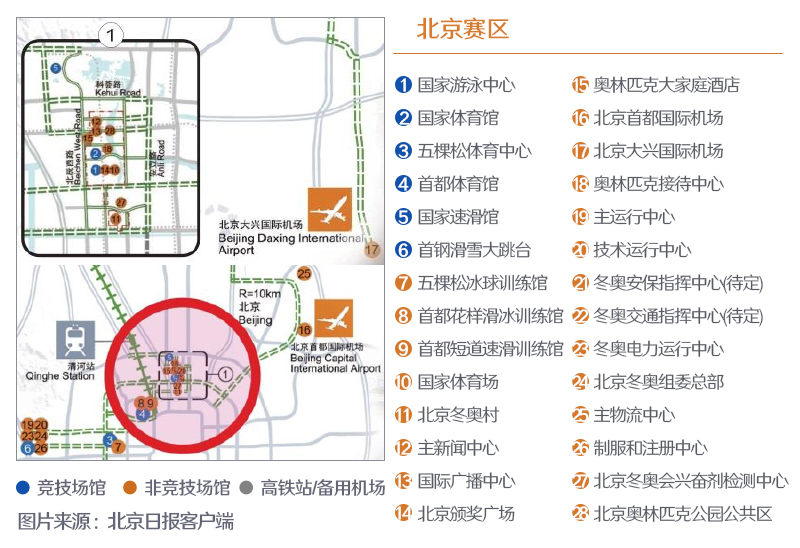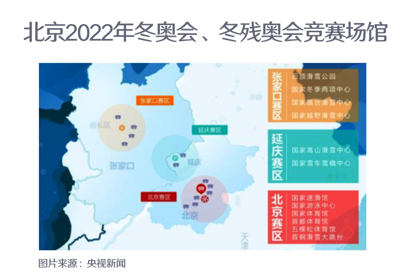 北京冬奥会设有北京、延庆和张家口三个赛区,共计划使用25个场馆,其中直接用于赛事的竞赛场馆12个。