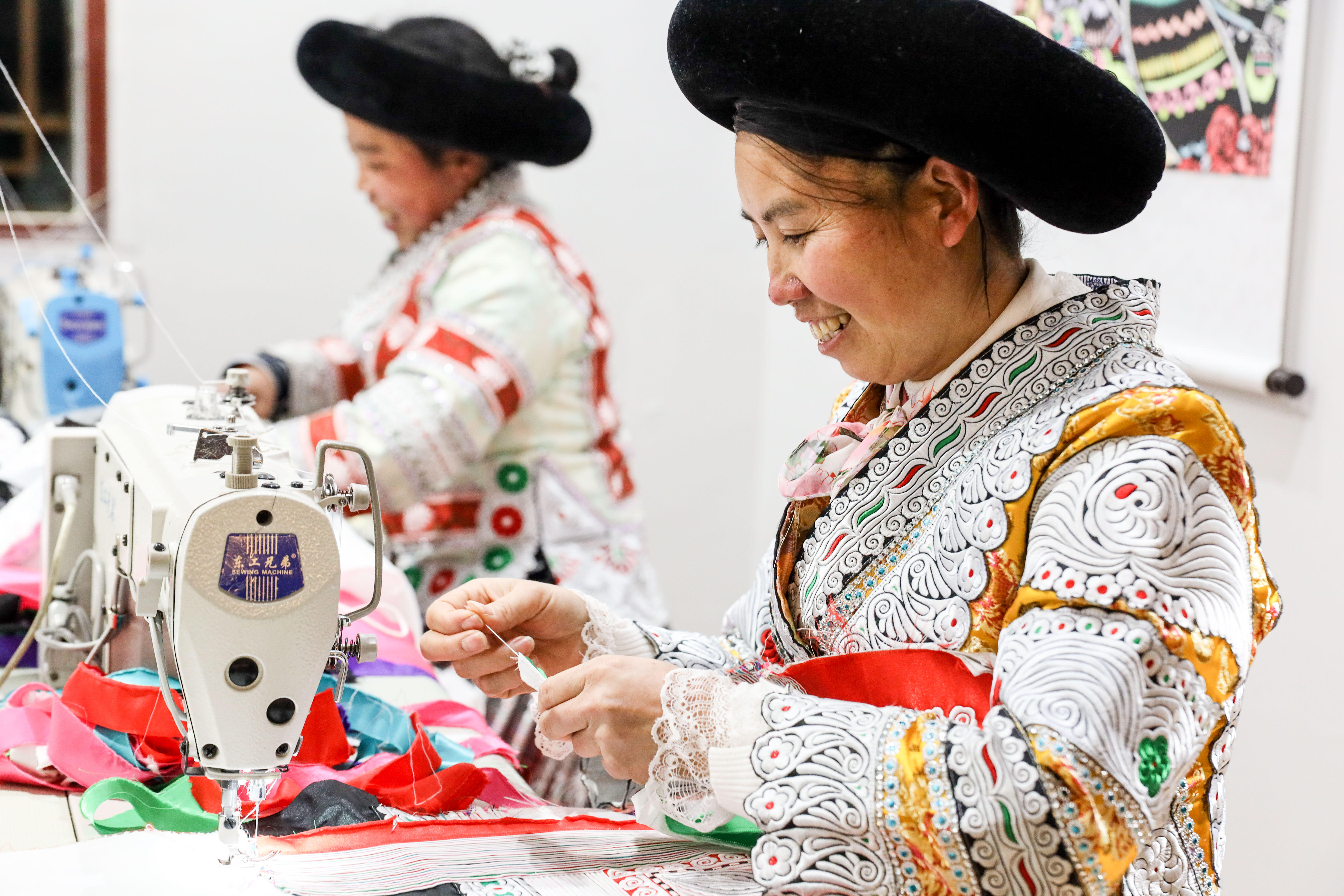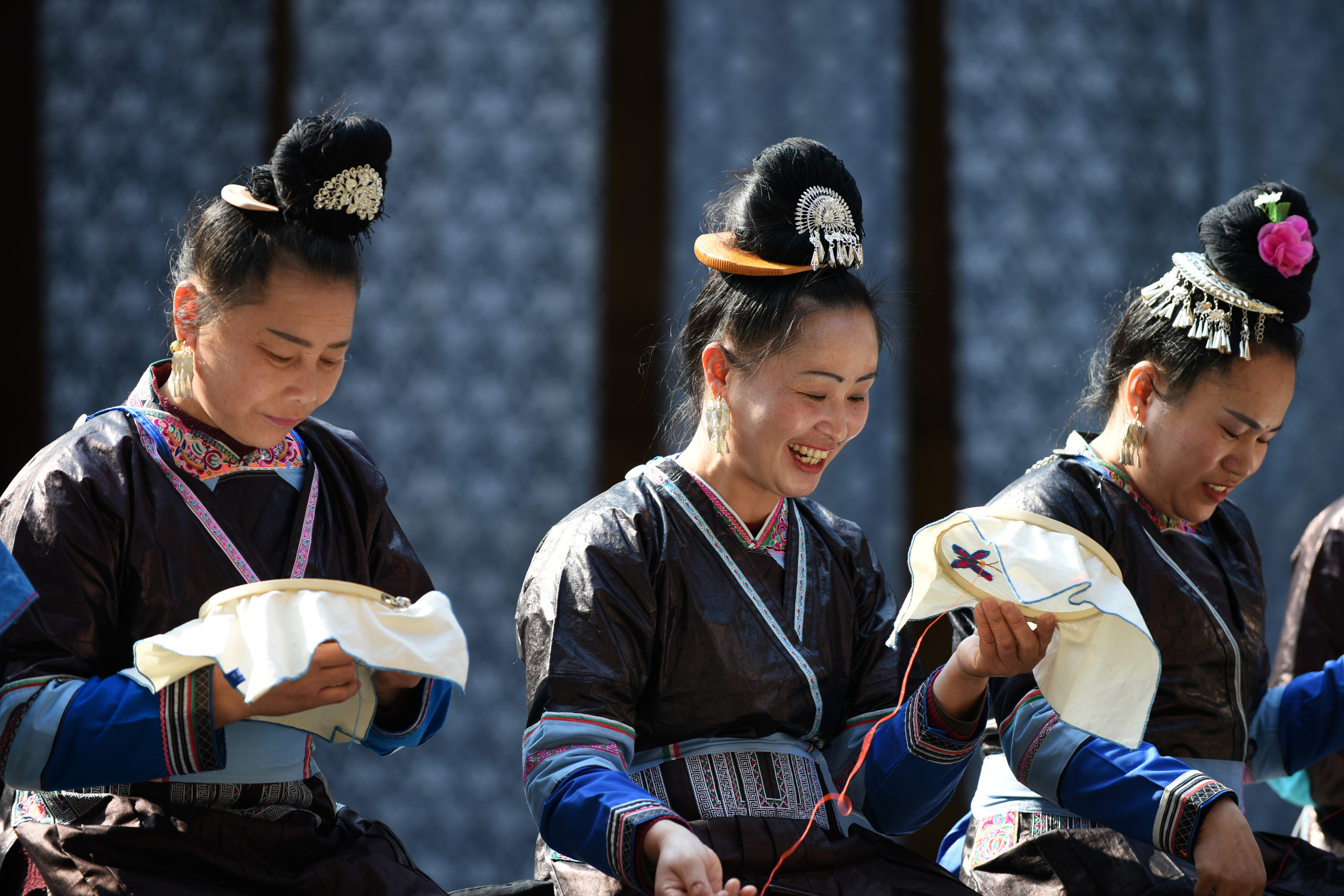 侗族妇女在贵州省黎平县侗品源传统工艺农民专业合作社里刺绣。(2019年3月12日摄)