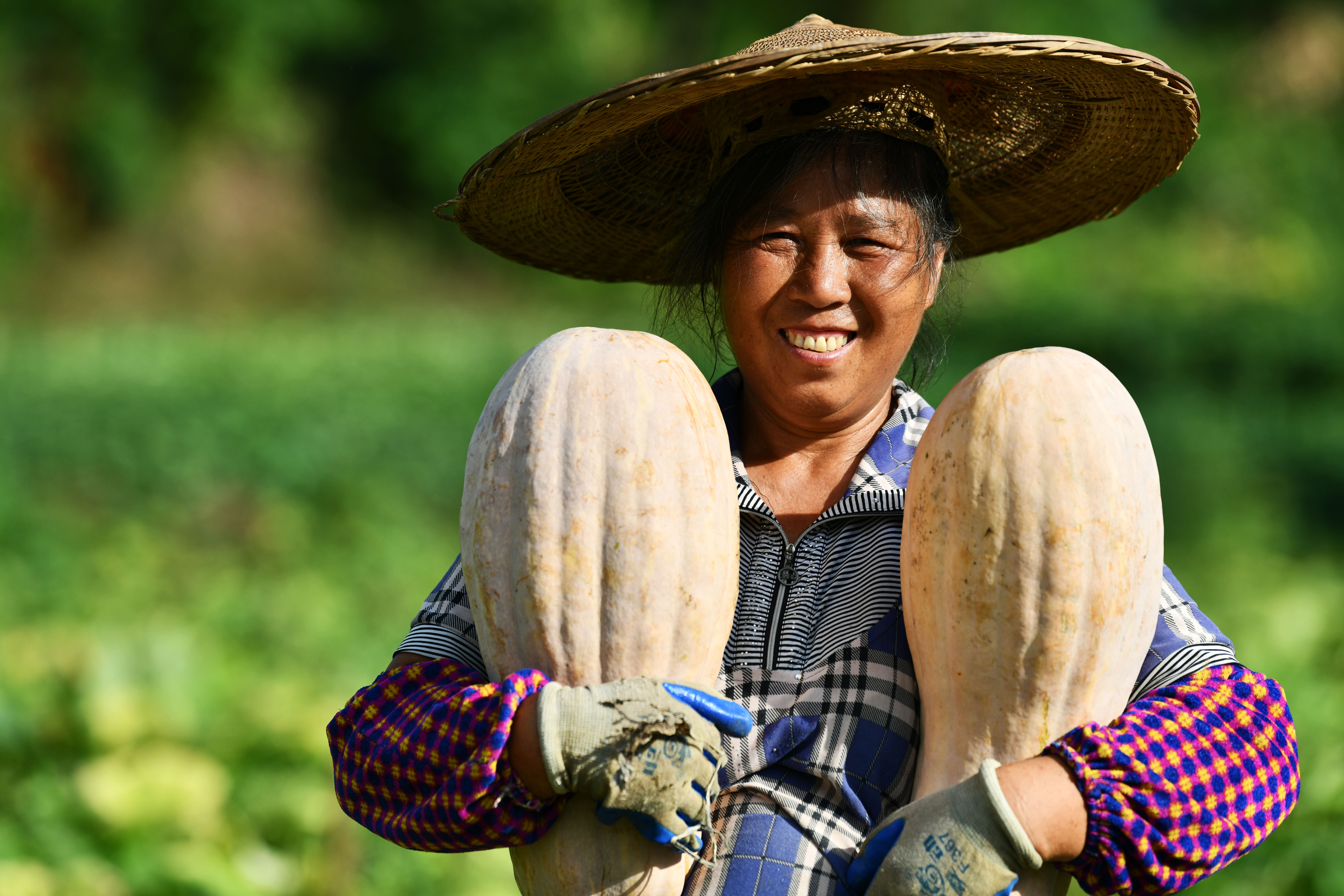 农民在贵州省思南县许家坝镇双坝坝区展示收获的南瓜。(2020年8月12日摄)