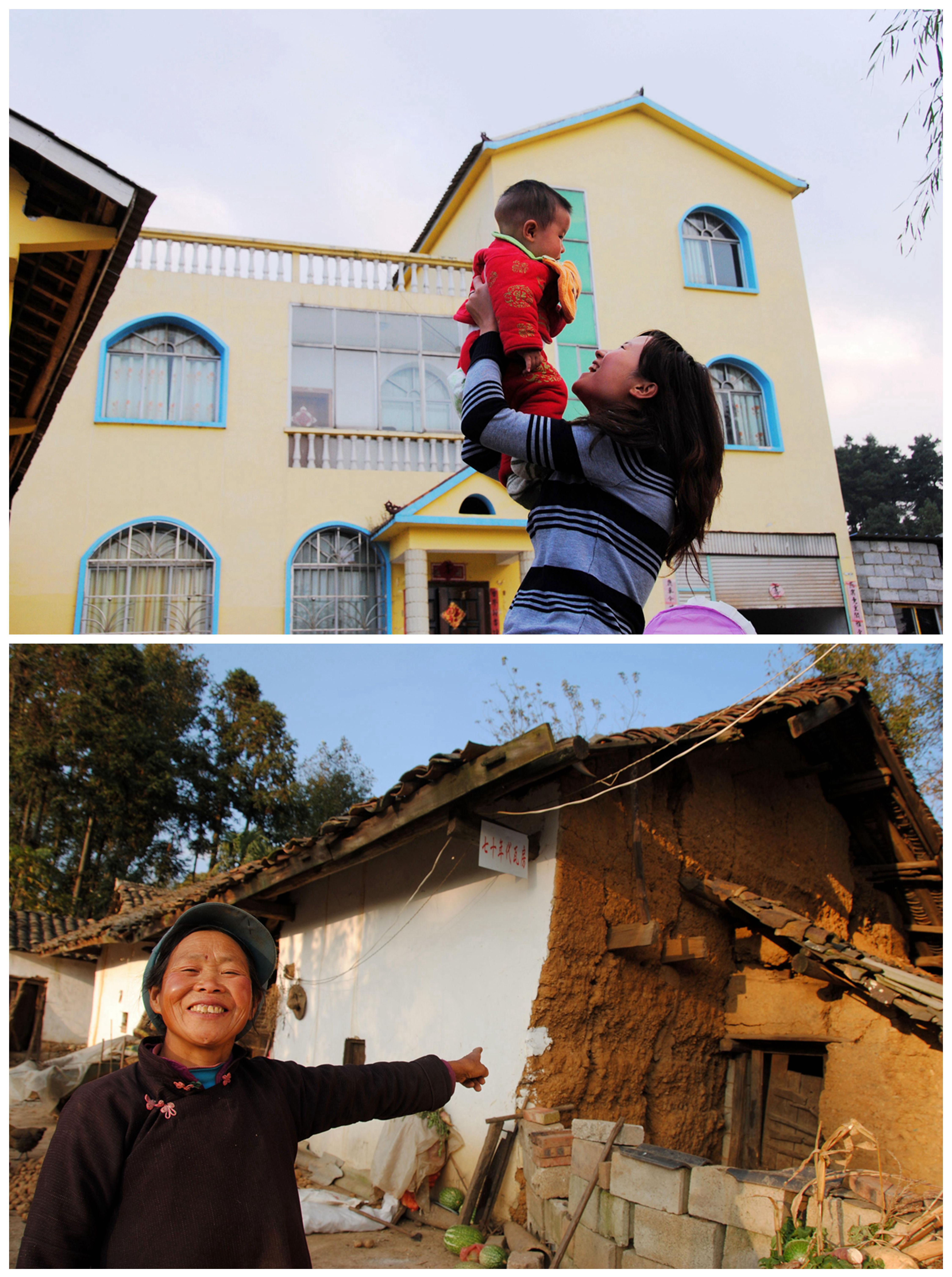 上图:贵州省威宁县草海镇白马村村民在自家屋前和儿子逗乐。(2012年11月3日摄)下图:威宁县上世纪70年代的土坯房,现在成了旅游参观的“文物”。(2012年11月3日摄)(拼版照片)