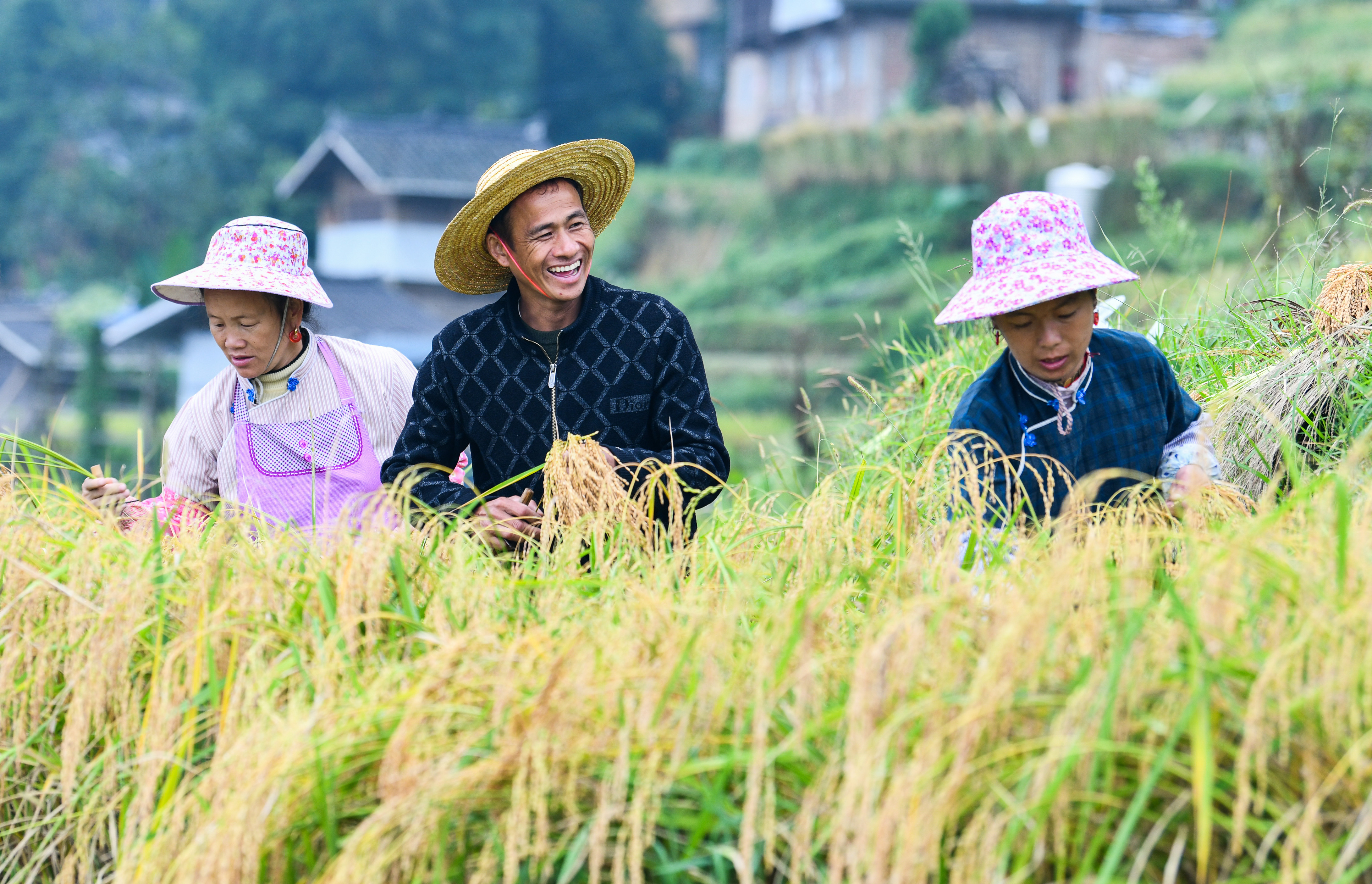 贵州省从江县加榜乡加车村的农民在收割水稻。(2020年9月19日摄)